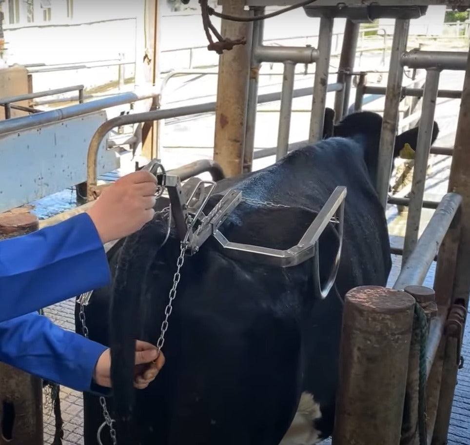 The TailJack is a simple, safe, and reliable device that locks onto the cow’s hips and keeps the tail up, preventing the cow from kicking.